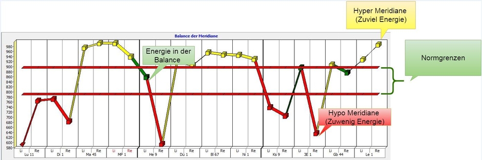 In der Graphik „Balance der Meridiane“ werden die Relationen zwischen den einzelnen Meridianen dargestellt. Es wird nicht die absolute Energie der Meridiane ausgewertet, sondern die Relationen unter den Meridianen.