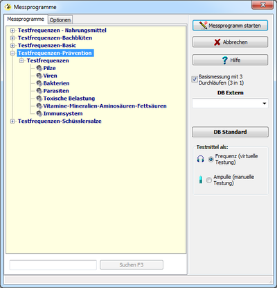- Testfrequenzen-Basic- meridianbezogene Gliederung aller in der Software enthaltenen orthomolekularen / homöopathischen Substanzen zum Austesten mittels Frequenzspektren;