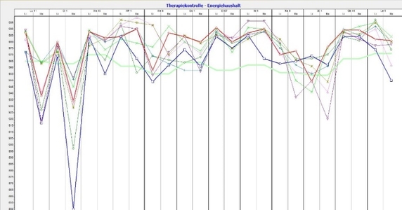 Für die Erzielung des Gleichgewichts, beim Klienten, ist die Ermittlung der Herkunft der Abweichungen ebenso wichtig wie die Anwendung der für die Person geeigneten Substanzen. In der Abb. Kontrolle Energiehaushalt – werden die Veränderungen der einzelnen getesteten Substanzen bezogen auf die „Norm-Linie / grüne Linie“ meridianbezogen dargestellt und können vom Therapeuten nachvollziehbar bewertet werden.